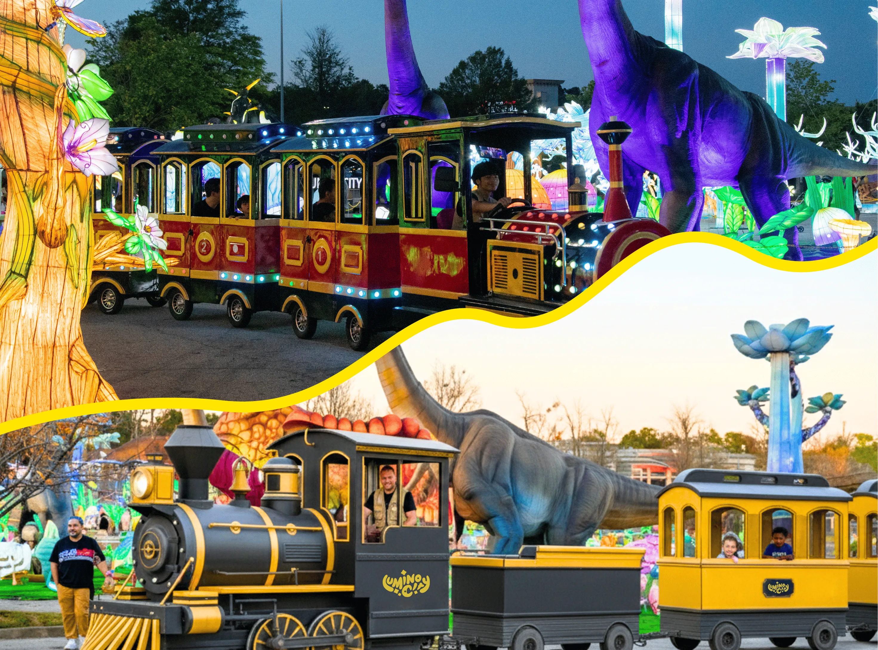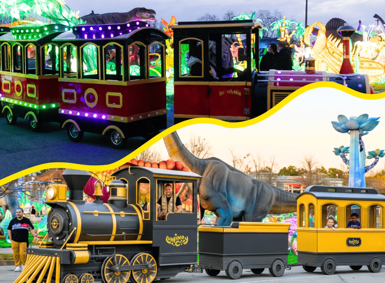 Pick one ride: Safari or Lumi Express Train! Sit back and travel in style through our luminous festival landscape. Stay inside—some Dinos look hungry! (Kids 3 & under ride free, must be accompanied by a paying adult.)